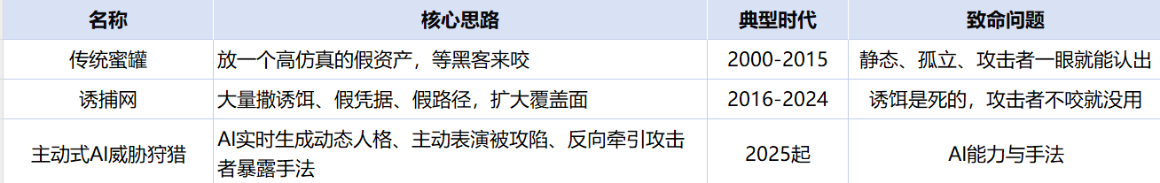 传统安全思维: “我放一个诱饵,等你来上钩。” → 被动、静态、靠运气,黑客不咬你就永远发现不了。
