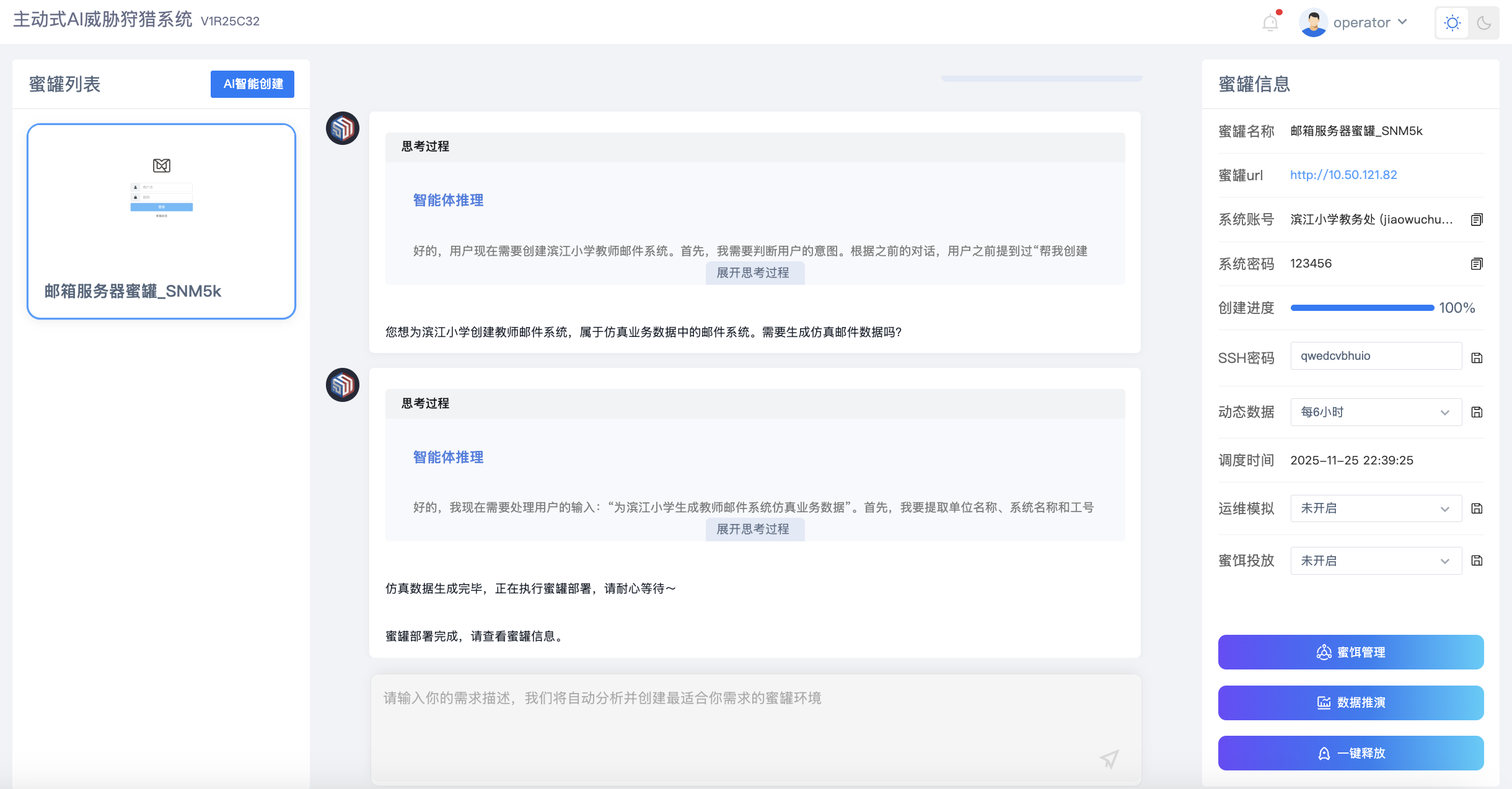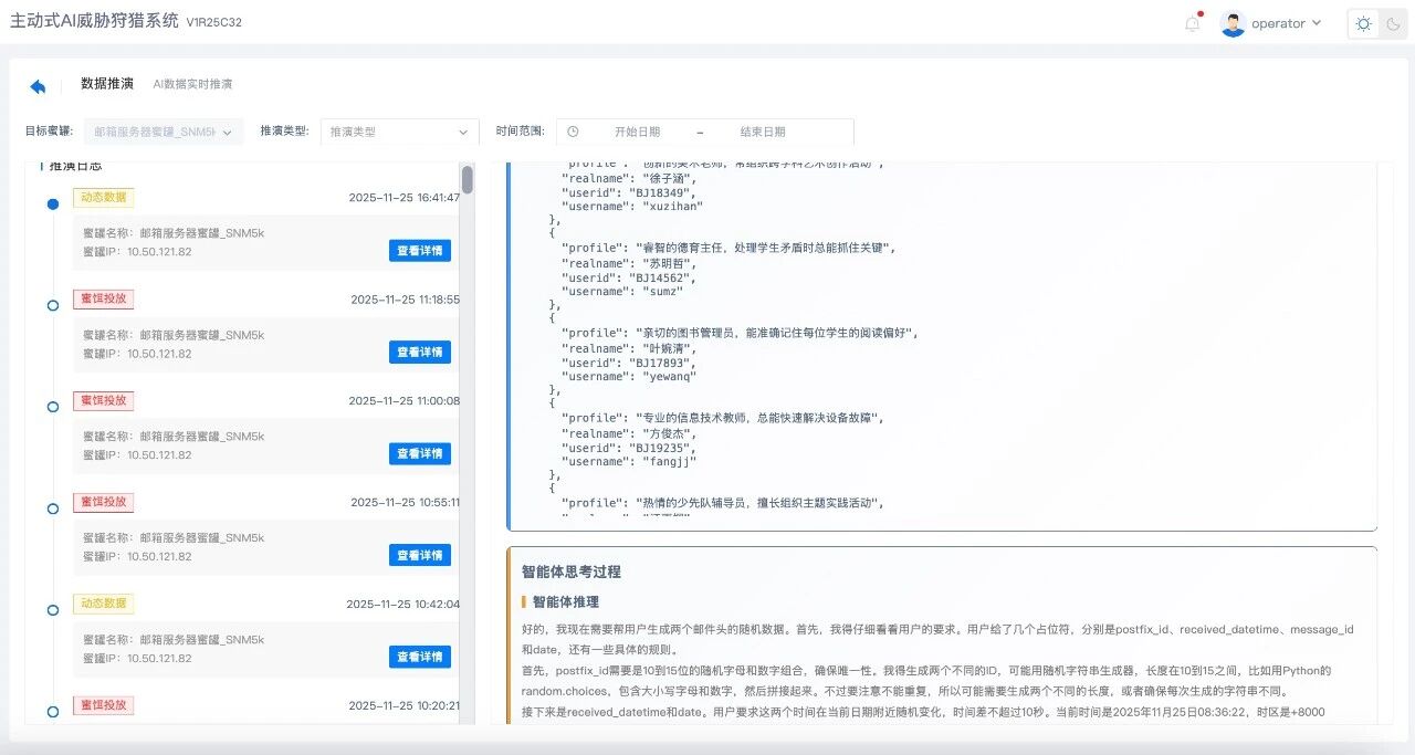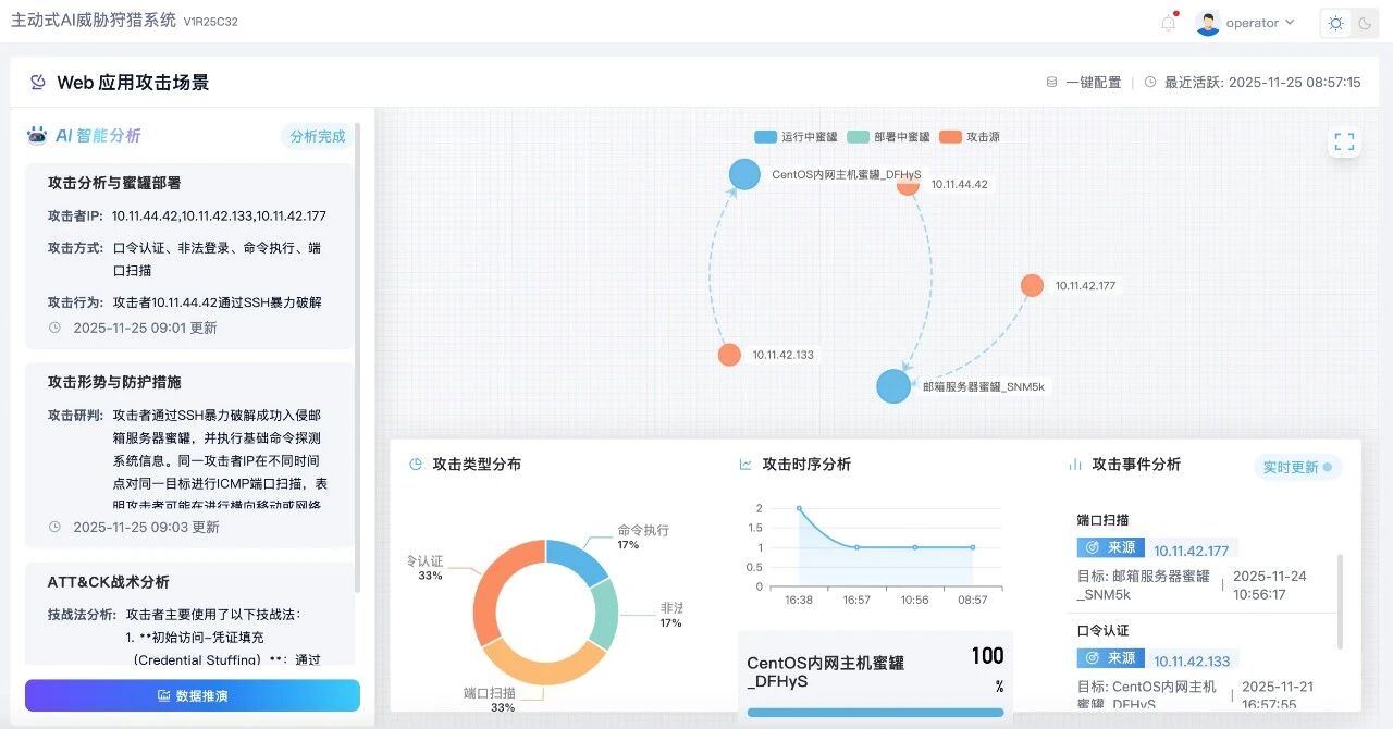 第三代主动式AI威胁狩猎:AI不再被动等咬,而是主动去“演”。 它会根据攻击者的每一步操作,实时生成对应的“受害者人格”,甚至故意露出破绽,诱导攻击者认为“这个目标太好打了”,从而把整条攻击链完整打出来——这才是真正的降维打击。