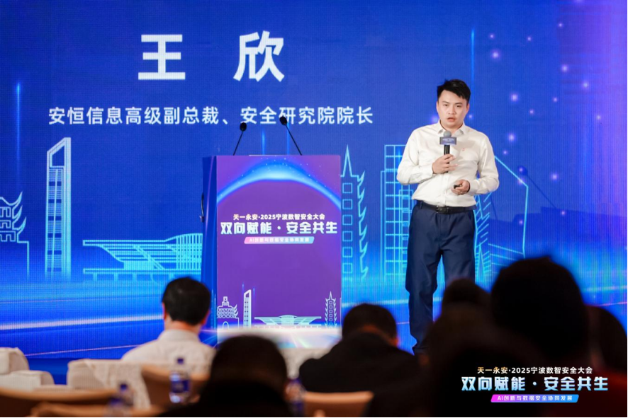 本次大会由宁波市委网信办、宁波市经信局、宁波市公安局、宁波市国资委、宁波市数据局、宁波高新区管委会、宁波市智能制造专家委员会指导,宁波数字产业集团有限公司主办,宁波市计算机信息网络安全协会、宁波市宁数安全科技有限公司承办,浙江省网络空间安全协会、中国联通宁波市分公司、华为技术有限公司协办。安恒信息高级副总裁、安全研究院院长王欣以“安全智变,AI时代下网络与数据安全的进化实践”为主题发表演讲。