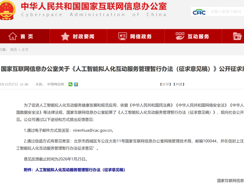 划重点|事关AI拟人化互动!国家网信办发布最新办法公开征求意见